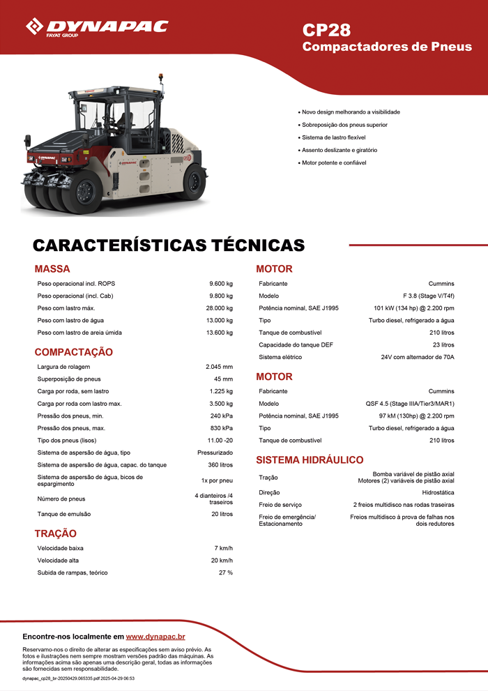 O Dynapac CP28 é o rolo compactador de pneus ideal para quem busca acabamento uniforme e produtividade. Com oito pneus e bicos aspersores individuais, ele oferece a maior sobreposição da categoria (45 mm), garantindo que o asfalto fique sem marcas e com compactação homogênea.
